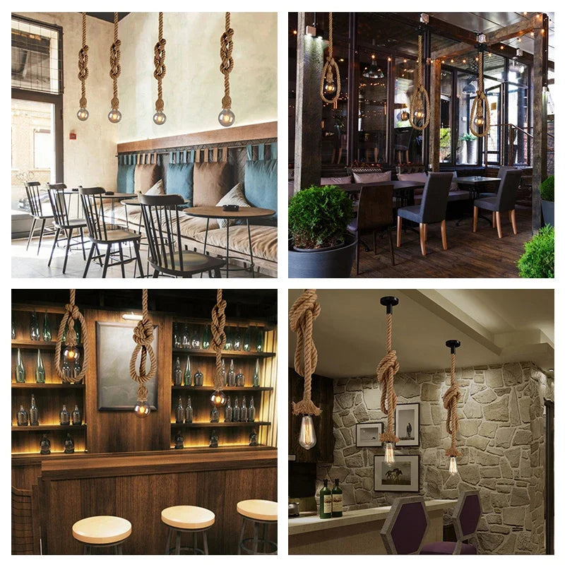 Luminária pendente vintage em corda de cânhamo – Soquete E27, estilo industrial.